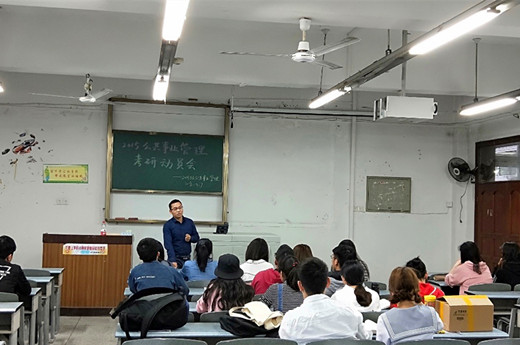 公共事業管理教研室主任李志剛在動員會上強調,非凡的毅力和頑強的定力是迎戰考研的重要因素。教師鄭小強則與同學們交流到:選專業要結合將來就業和興趣導向,選學校要結合專業背景和工作地點,使大家受益匪淺。其中,以421分的初試高分被重慶大學錄取的2014級公共事業管理專業的王靜,傾囊相授考研心得,毫無保留得將自己復習經驗分享給同學們。同年級專業的李倩被中南大學錄取,她從心態方面為大家答疑解惑,希望大家樹立一個良好的心態,堅持是基本,技巧是關鍵,要認真準備才能無愧于心。