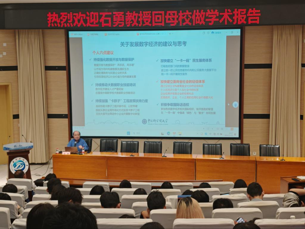 10月22日下午,中國科學院大學講席教授、發展中國家科學院院士、國際歐亞科學院院士、國務院參事、中國科學院虛擬經濟與數據科學研究中心主任、博士生導師、杰出校友石勇教授在思學樓A114報告廳作題為《數字經濟的發展與未來》的學術報告。經濟管理學院院長鄭小強主持報告會。學院學術骨干、青年教師和研究生代表等200余名師生到場聽取報告。