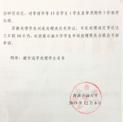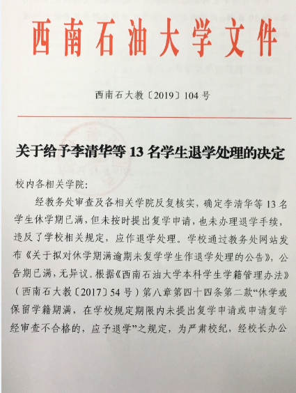 附:《關于給予李清華等13名學生退學處理的決定》(西南石大教【2019】104號)