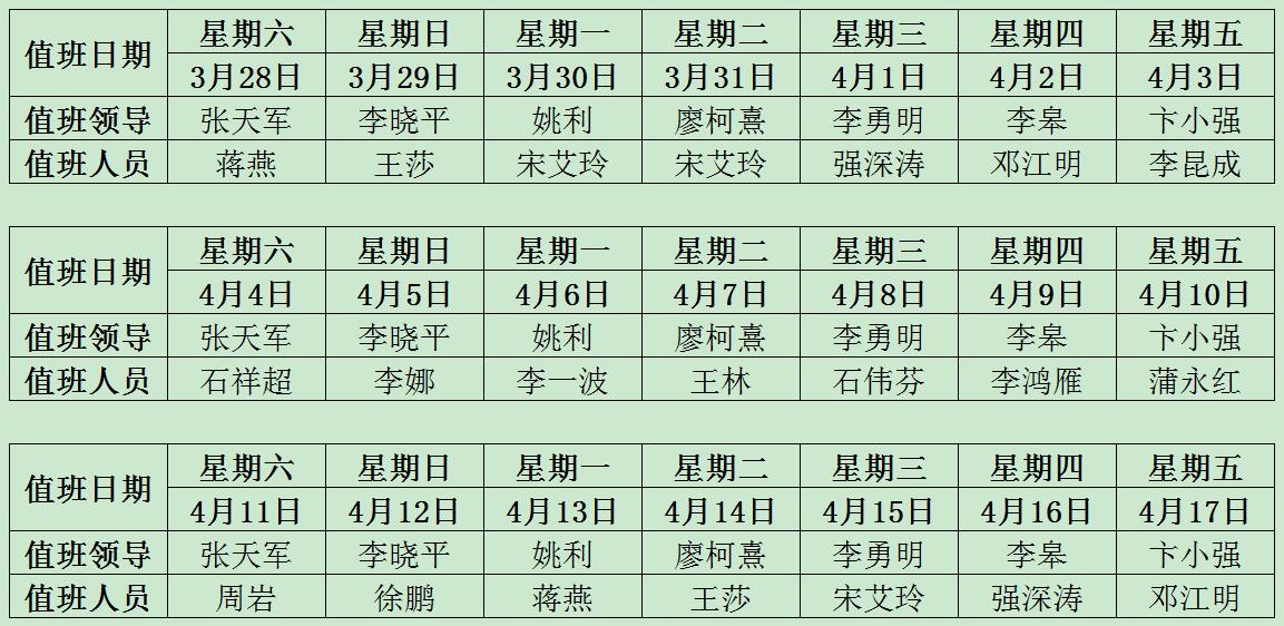 疫情防控期間石工院機(jī)關(guān)值班安排(2020.3.28—2020.4.17)