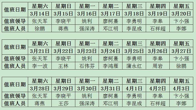 疫情防控期間石工院機關值班安排(2020.3.14—2020.4.3)