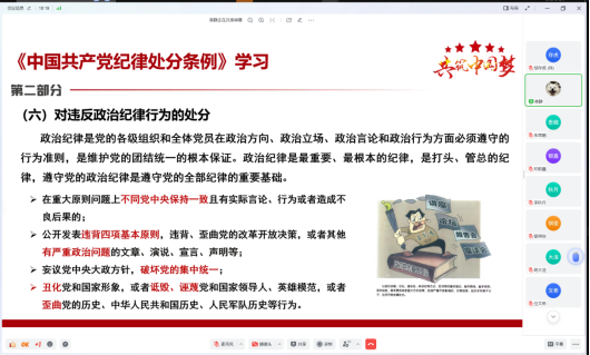 活動伊始,蔣靜首先介紹了《中國共產黨紀律處分條例》的重要性和必要性,指出黨的紀律是管黨治黨的“戒尺”,是黨員、干部約束自身行為的標準和遵循。只有嚴格遵守黨的紀律,才能確保黨的團結統一,為以中國式現代化全面推進強國建設、民族復興偉業提供堅強紀律保障。隨后,蔣靜為大家詳細講解了《中國共產黨紀律處分條例》制定的目的和原則,以及黨員、黨組織可能面臨的紀律處分種類,重點講解了處分條例中對政治紀律、組織紀律、廉潔紀律、群眾紀律、工作紀律、生活紀律等六類違反黨的紀律行為的處分,使支部成員對黨的紀律有了更加清晰的認識。為了加深大家對政治紀律這一黨內最根本最重要的紀律的理解與認識,還組織觀看了中央紀委國家監委網站制作的“黨史中的紀律”宣傳教育視頻。通過觀看視頻,支部成員深刻感受到了政治紀律的嚴肅性和重要性,要嚴格遵守政治紀律,做政治上的明白人。