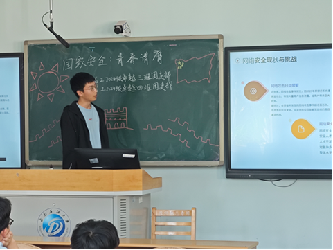 在講解國家安全面臨的挑戰時,三班團支書深入剖析了傳統安全威脅與非傳統安全威脅的現狀與特征。從局部戰爭到網絡攻擊,從生態退化到新發傳染病,一系列現實問題擺在團員們面前。針對網絡安全現狀,三班團支書強調指出網絡攻擊頻繁、數據泄露風險加劇以及人才缺口大等問題,并提出加強技術防護、強化安全管理和推動國際合作等措施。同時,圍繞生態安全和公共衛生安全,團支書也詳細介紹了相應的現狀挑戰與保障措施,強調了生態保護修復、綠色發展以及完善公共衛生體系等的重要性。