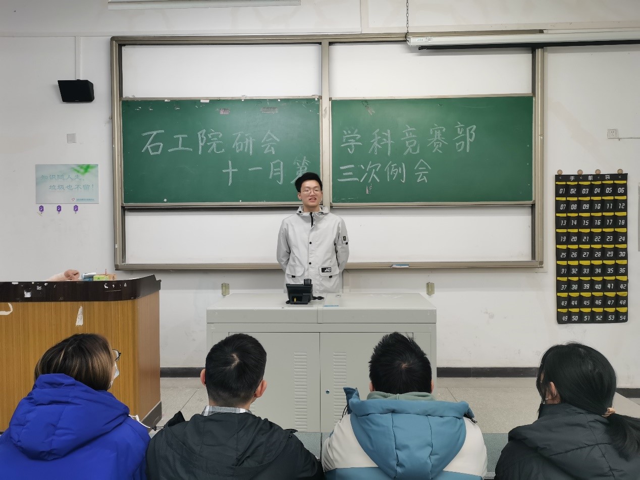 為增強學科競賽部部門人員的工作效率,并及時公示2021-2022秋季上半學期院級活動參與情況。2021年11月30日晚上21:30,石工院研會學科競賽部于明辨樓C103召開了十一月第三次例會,本次例會由學科競賽部執行主席楊瓊主持,學科競賽部全體成員參會。