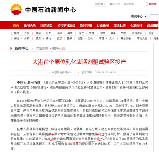 據悉,2018年中國原油產量1.89億噸,對外依存度逼近70%,然而,我國油田普遍進入開發中后期,60%的主力油田進入高含水、高采出程度的“雙高”開發階段,大幅度提高老油田采收率具有重要的戰略意義。針對傳統化學驅在高溫高鹽油藏和配注平臺受限的油藏面臨的瓶頸制約,蒲萬芬教授課題組和新疆油田分公司、大港油田分公司和西北油田分公司研究人員聯合攻關,形成了低成本、綠色、高效的原位乳狀液驅油新技術。原位乳狀液驅油新技術近期將在大港油田分公司和西北油田分公司開展先導性試驗。