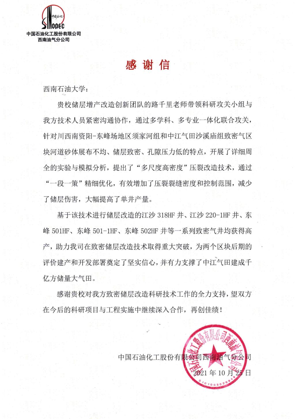 中國石油化工股份有限公司西南油氣分公司發(fā)來的感謝信