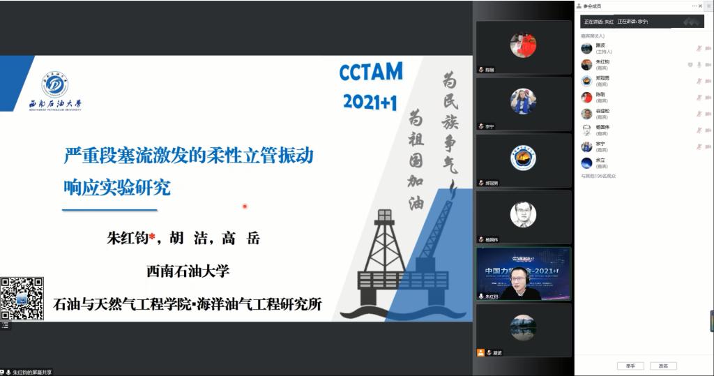 朱紅鈞作了題為“嚴重段塞流激發的柔性立管振動響應實驗研究”報告,展示了我校海洋工程流動安全與控制團隊近年來在多相內流流致振動方面的研究成果。共有268名觀眾線上聽會,報告引起了參會人員的熱烈討論。主持人中國空氣動力研究與發展中心高速空氣動力研究所所長路波教授評價:采用的測試方法和實驗結論為研究流固耦合力學的同志提供了嶄新思路。