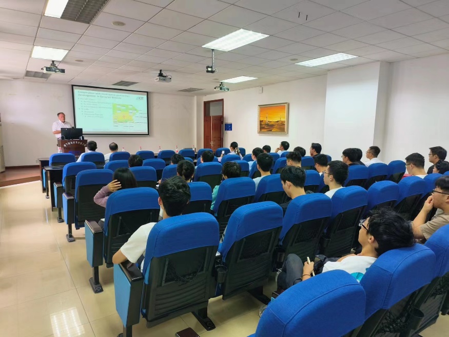 在報告中,Thomas Kohl教授首先介紹了地熱能利用的背景,指出地熱能是目前最大但尚未開發的資源,具有巨大的發展潛力。目前地熱能的年發電量為15 GWe,而國際能源署組織預測,2055年地熱能的年發電量將超過500 GWe。Thomas Kohl教授介紹了他負責的KIT地熱項目的主要研究人員和研究現狀。他結合生產實例,介紹了數值模擬方法在研究地熱能開發過程中所遇到的主要問題和解決思路,并提出未來研究方向。我院青年教師任冀川、田野、張濤等與同學們就報告主題與Thomas Kohl教授進行互動,參會者對地熱能的開發和利用有了更加深刻的理解,也進一步豐富了學術交流成果。