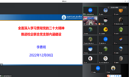 12月8日下午,油氣儲運(yùn)工程研究所黨支部和西南管道公司技術(shù)中心第二黨支部聯(lián)合線上開展“同上一堂黨課”主題黨日活動(dòng)暨支部共建啟動(dòng)會。會議由西南管道技術(shù)中心第二黨支部書記宋雪峰與儲運(yùn)所黨支部書記吳瑕共同主持,石工院副院長李勇明、技術(shù)中心副經(jīng)理劉俊江,技術(shù)中心第二黨支部與儲運(yùn)所黨支部全體黨員同志參加會議。