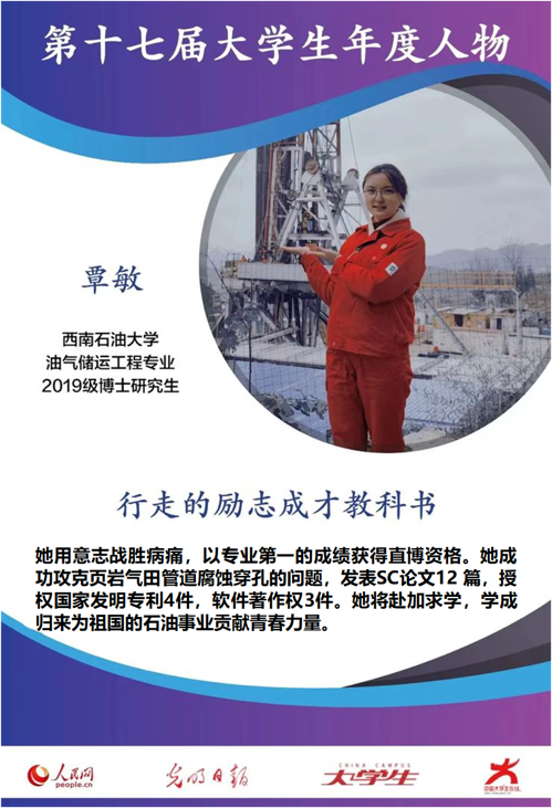 近日,由教育部、人民日報社共同指導,人民網、光明日報教育部、《大學生》雜志和中國大學生在線聯合主辦的第十七屆“大學生年度人物”推選展示活動,經組織推薦、通訊推選、會議推選等環節,共遴選出第十七屆“大學生年度人物”20名、提名獎30名、入圍獎109名。我校石油與天然氣工程學院博士覃敏榮獲第十七屆“大學生年度人物”。
