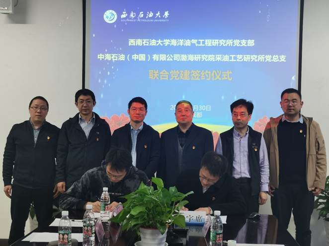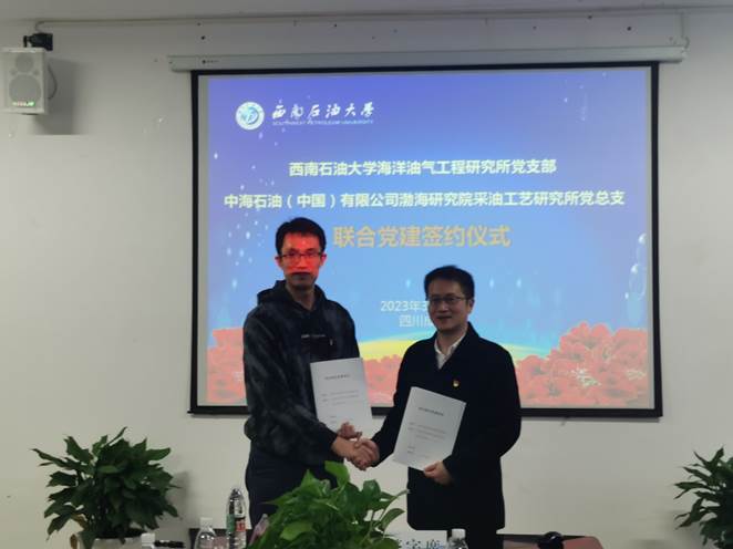 為深入貫徹落實習近平新時代中國特色社會主義思想和黨的二十大精神,同時也為構建校企黨組織“優(yōu)勢互補、資源共享、互相促進、共同提高”的黨建工作新格局,3月30日下午,海洋油氣工程研究所黨支部與中海石油(中國)有限公司渤海研究院采油工藝研究所黨總支在明辨樓B519舉行聯(lián)合黨建簽約儀式,標志著校企黨建活動邁上新臺階。西南石油大學石工院黨委書記張?zhí)燔姟⒑S退p帶頭人黨支部負責人朱紅鈞及海洋油氣工程研究所黨支部全體教師黨員參加儀式,儀式由海洋油氣工程研究所所長劉平禮主持。
