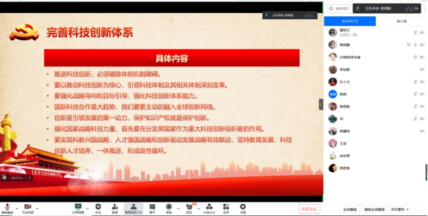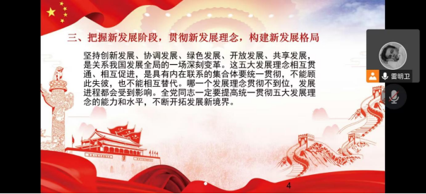 活動伊始,第三小組組員雷明衛以宣講ppt的形式詳細地向黨員們介紹“推動經濟高質量發展”這一主題的重要意義和內容,向大家介紹了經濟高質量發展的六個內涵,和推動經濟高質量發展的六個方向,讓同志們意識到了推動經濟高質量發展的重大現實意義和深遠歷史歷史意義。第二部分是由第二小組組員楊明暄為大家講述“實施科教興國戰略,強化現代化建設人才支撐”的意義和目的,讓大家知道了推動科技創新的重要性,完善科技創新體系的政策方法。