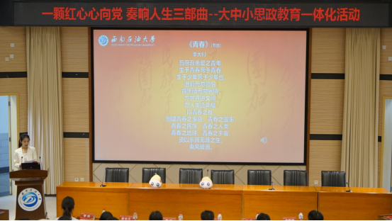 為深入開展學習貫徹習近平新時代中國特色社會主義思想主題教育,落實“‘大思政課’我們要善用之”的要求,值此五四青年節之際,四川省“紅心柚”名輔導員工作室于西南石油大學舉行“一顆紅心心向黨,奏響‘人生三部曲’”大中小思政教育一體化活動。新都一中實驗學校初中部,小學部的少先隊員、共青團員,石工院柚夢青年學生黨支部、國脈鉅工學生黨支部、大“油”可為學生黨支部以及碩士四、五、六支部的師生黨員齊聚一堂開展大中小思政教育一體化主題黨日活動。活動由四川省“紅心柚”名輔導員工作室負責人、大“油”可為學生黨支部書記舒小立主持。
