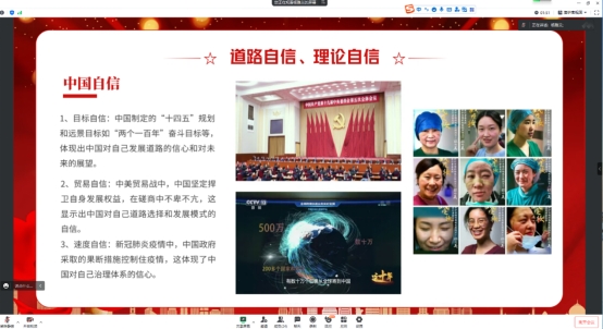 楊雅蘭帶領(lǐng)同學(xué)們深入學(xué)習(xí)馬克思主義中國特色社會主義理論體系,增強“四個意識”、堅定“四個自信”,傳承紅色基因,弘揚愛國奮斗精神。以人民為中心是我們黨的根本立場。楊雅蘭領(lǐng)學(xué)中提及到要把人民滿意度作為檢驗工作唯一標(biāo)準(zhǔn),必然要提高黨員關(guān)心人民群眾新期待新要求,在學(xué)習(xí)和社會實踐中也要不斷取得新進展新成效,增強人民群眾的獲得感、幸福感、安全感,作為廣大青年學(xué)生,必須把控正確方向和奮斗目標(biāo)。