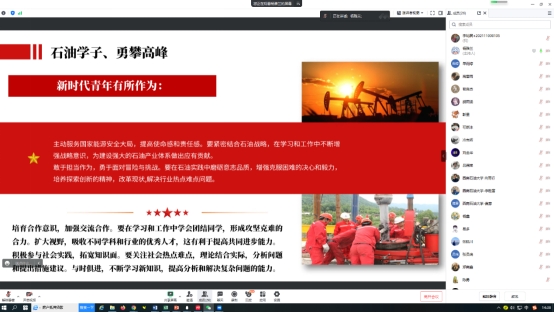 最后,楊雅蘭同志以自身為例,認為我們必須要把思想政治教育擺在首位,組織好日常教育,引領(lǐng)同學(xué)根植愛國情懷,踐行社會主義核心價值觀,培養(yǎng)德智體美全面發(fā)展的合格社會主義建設(shè)者和接班人。作為當(dāng)代研究生,我們則必須主動服務(wù)國家能源安全大局,提高使命感和責(zé)任感。要緊密結(jié)合石油戰(zhàn)略,在學(xué)習(xí)和工作中不斷增強戰(zhàn)略意識,為建設(shè)強大的石油產(chǎn)業(yè)體系做出應(yīng)有貢獻。堅守青春之我,奮斗之我,敢于從容不迫的面對各種風(fēng)險挑戰(zhàn)。