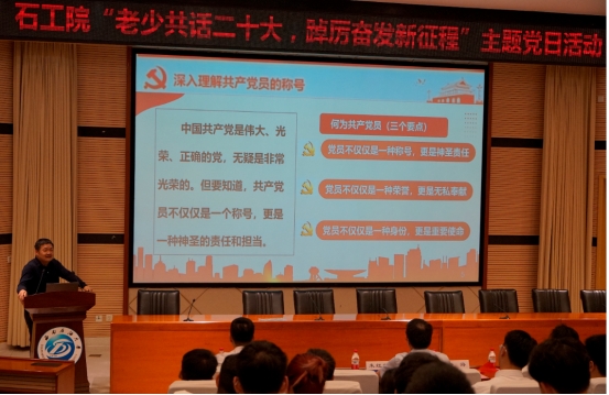 活動伊始,唐海教授從“能源的飯碗必須端在自己手里”切入,強(qiáng)調(diào)能源建設(shè)對國家重大意義,并從“領(lǐng)悟中國共產(chǎn)黨黨員的深刻含義”“怎樣履行中國共產(chǎn)黨黨員的責(zé)任與使命”“油氣能源行業(yè)青年黨員應(yīng)有的責(zé)任與擔(dān)當(dāng)”三個方面闡述了青年黨員肩上的責(zé)任,指出了能源強(qiáng)國背景下油氣能源行業(yè)青年黨員的奮斗道路任重而道遠(yuǎn)。“世界是你們的,也是我們的,但歸根結(jié)底是你們的。”唐海引用毛澤東同志的話,表達(dá)了對青年黨員同志的殷殷期盼,用40余年從教生涯的點(diǎn)滴詮釋了愛崗敬業(yè)、平凡而偉大的“五老”精神。