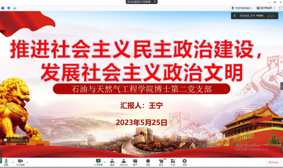2023年5月25日石工院博士第二黨支部通過騰訊會議圍繞《習近平新時代中國特色社會主義思想專題摘編》第七章“論堅持全面深化改革”以及第八章“推進社會主義民主政治建設,發展社會主義政治文明”學習內容開展了主題教育。會議由王寧同志主持,全體黨員同志參與。