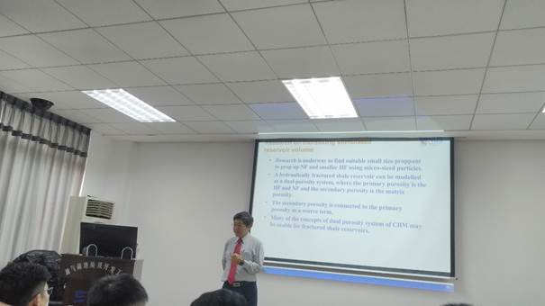 劉漢中在講座中介紹了頁巖油藏目前的開采狀況,他講到在頁巖油藏開采中,頁巖致密、孔隙度和滲透率低是制約采收率的關鍵問題,提出通過新型適當粒徑的支撐劑對頁巖油藏進行裂縫的開裂和支撐,分析了頁巖裂縫的擴張規律及引入支撐劑后的伸展狀況,詳細介紹了支撐劑的材料類型、物理特性、不同的輸送方式以及與頁巖地層的配伍情況。通過模擬對這種新型支撐劑的使用效果進行了評價,從現場和實驗室結果都能為提高頁巖采收率提供穩定可靠的技術支持。為同學和老師們在頁巖油藏提高采收率方面提供了新的研究動向。最后劉漢中教授簡單介紹了目前他研究的新方向:涉及到下一代新型的納米技術,用于研究更為有效的支撐劑;新型的泡沫劑用于控制流動的新技術和永久凍土層中的天然氣水合物開采研究。