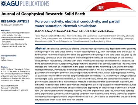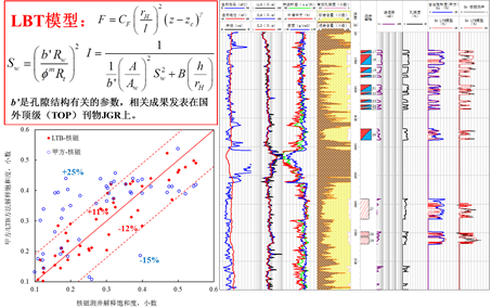 針對致密油藏特殊地質環境,通過資料調研、室內實驗和逾滲網絡模擬研究,詳盡分析區域儲層巖石孔喉結構和流體性質。研究表明傳統阿爾奇公式不適應于這類儲層的含水飽和度解釋。從巖石孔喉特征出發,重新推導巖石電阻增大系數模型是從根本上解決這一問題的有效對策。依托李閩教授團隊在多孔介質基礎科學領域的研究成果,研發出適用于致密砂巖儲層的地球物理電法測井解釋模型——LBT模型(相關研究成果已發表在《Journal of GeophysicalResearch-Solid Earth》),并形成一套與之對應的電法測井解釋技術。