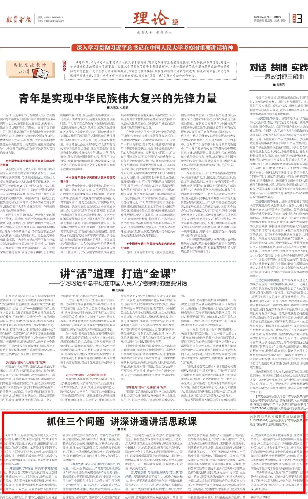 學院黨委副書記林莉教授題為《抓住三個問題 講深講透講活思政課》的文章在《教育導報》2022年第52期(總共3700期)導報理論版刊登。