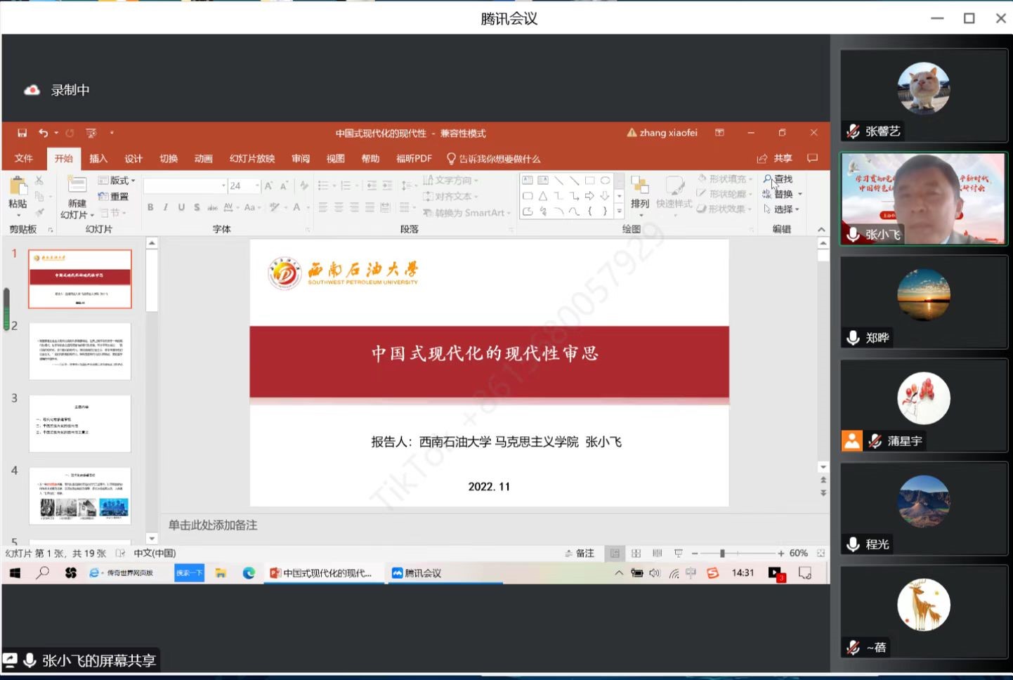 2022年11月26日,研究生教研室張小飛教授應邀參加了“學習貫徹黨的二十大精神暨習近平新時代中國特色社會主義思想研討會”,并在研討會中作了題為“中國式現代化道路的現代性審思”的主題發言。該研討會在騰訊會議上進行,研究生教研室其他教師也參與其中,全程收聽了此次研討會內容,并在會后作了進一步學習交流。