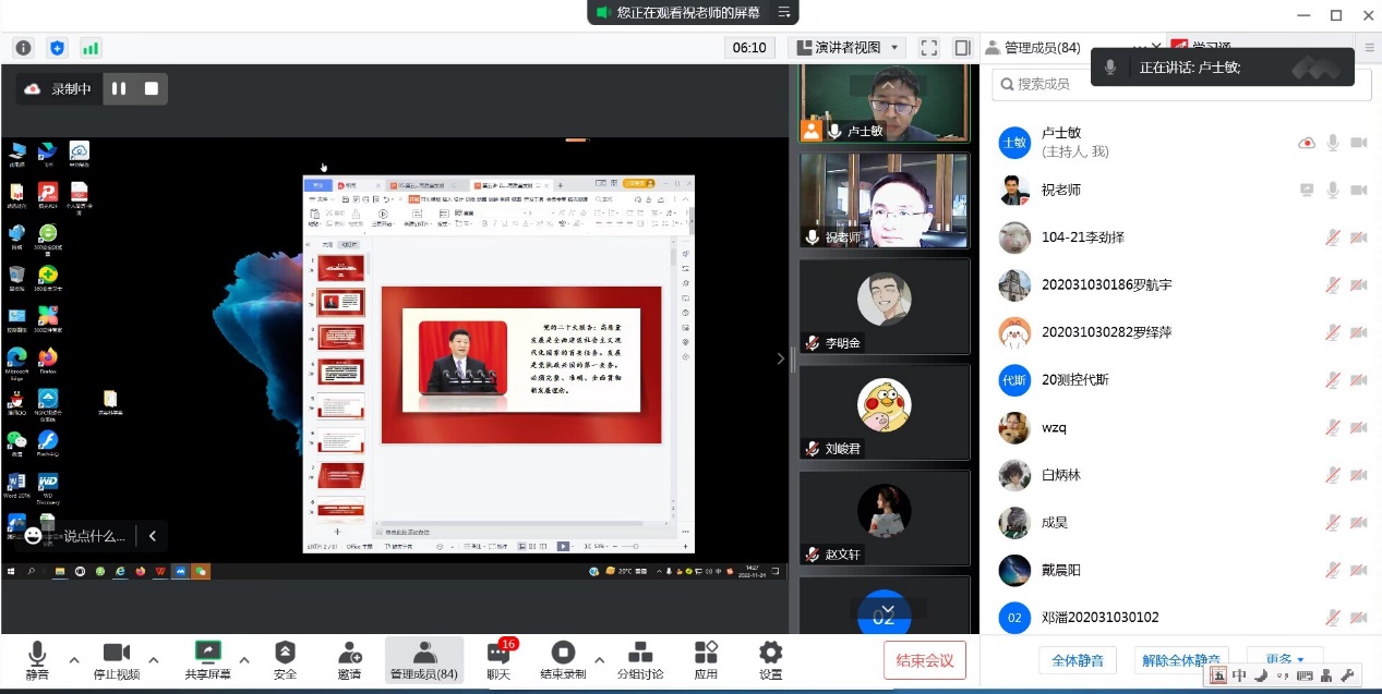 11月24日下午,黨委常委、副校長祝效華為機電院2020級學生講授了思政課,講授內容為《習近平新時代中國特色社會主義思想概論》課第五講以新發展理念引領高質量。因疫情防控,課程采用騰訊會議平臺線上教學。
