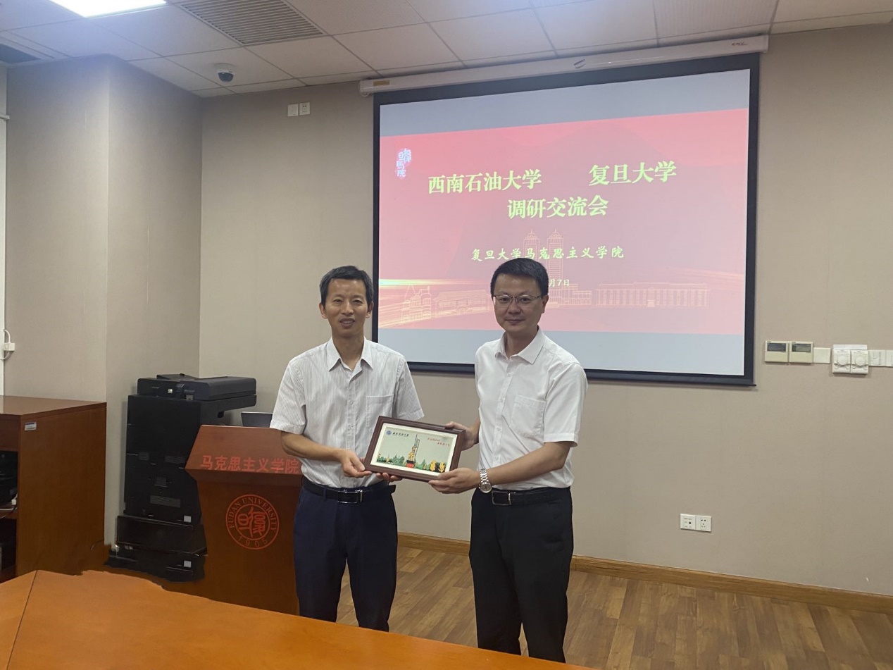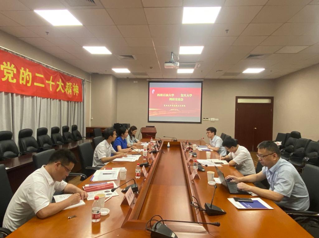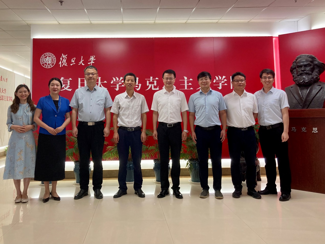 為深入學習貫徹習近平新時代中國特色社會主義思想,加強調查研究,推進馬克思主義理論學科高質量發展,7月7日,學院黨委書記、院長崔發展一行赴復旦大學馬克思主義學院開展調研座談,就學科建設、課程建設、思想政治理論課教學改革、人才培養等方面開展座談交流。學院黨委副書記、紀委書記林莉、黨委組織員包治國、毛中特教研室主任李明橋、思想道德與法治教研室主任楊莉一同參加了調研。復旦大學馬克思主義學院副院長譚嵩、副院長張新寧、教學辦公室劉翔宇參加交流座談。座談會由復旦大學馬克思主義學院副院長譚嵩主持。