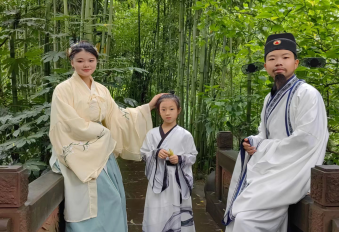 9點(diǎn),團(tuán)隊(duì)抵達(dá)三蘇祠,彼時(shí),眉山市正是陰雨綿綿,頗有蘇東坡筆下“細(xì)雨斜風(fēng)作曉寒,淡煙疏柳媚晴灘,入淮清洛漸漫漫”的意味,但這并沒有減弱大家拍攝的熱情。為達(dá)到最佳拍攝效果,幾位同學(xué)以古裝示人,除了主講人的理論講述,視頻中會(huì)穿插多個(gè)小劇場(chǎng)的表演。在人聲鼎沸的三蘇祠,這給拍攝帶來了極大的挑戰(zhàn)。好在導(dǎo)演運(yùn)鏡專業(yè),“演員們”也十分認(rèn)真,同學(xué)們不顧游客的眼光,自如地表演出了文稿中的感覺。飾演蘇母的夏演同學(xué)感嘆到:文藝工作者真的十分辛苦。這次拍攝雖然累,但很有收獲。在演戲的過程中,我也更進(jìn)一步地領(lǐng)會(huì)“讀書正業(yè)、孝慈仁愛、非義不取、為政清廉”的蘇門家風(fēng)。