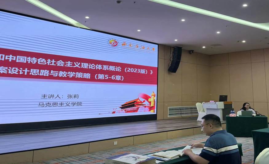 張莉老師聚焦《概論課》第五章和第六章內容,從學情調查與分析方法;教案設計思路與教學策略;教學重難點內容分析與把握;教學案例的選擇與運用;教學資源、教學媒體、教學方法和手段的應用;教學導入、展開、互動、討論、總結各環節設計與實現;教案設計的創新點和教學持續改進措施等方面進行匯報和交流。