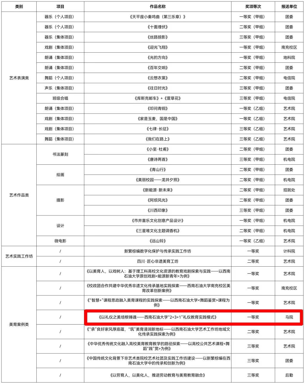 我校在本次展演活動中取得歷史最好成績,獲得省級一等獎12項(xiàng)、二等獎11項(xiàng)、三等獎10項(xiàng),學(xué)校被授予“優(yōu)秀組織獎”。在美育案例類項(xiàng)目中,獲得省級一等獎4項(xiàng)、二等獎1項(xiàng)、三等獎3項(xiàng),其中我院的作品《以禮儀之美培根鑄魂—西南石油大學(xué)“2+3+1”禮儀教育實(shí)踐模式》獲得一等獎。
