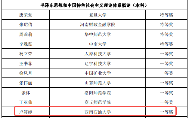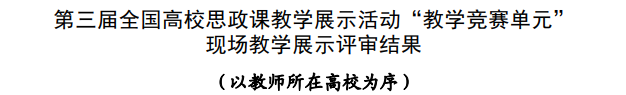 近日,教育部公示了第三屆全國(guó)高校思想政治理論課教學(xué)展示活動(dòng)“教學(xué)競(jìng)賽單元”評(píng)審結(jié)果。我院任重遠(yuǎn)老師榮獲“馬克思主義基本原理”組特等獎(jiǎng),盧婷婷老師榮獲“毛澤東思想和中國(guó)特色社會(huì)主義理論體系概論”本科組一等獎(jiǎng),邵琪老師榮獲“中國(guó)近現(xiàn)代史綱要”組一等獎(jiǎng),崔發(fā)展老師榮獲“中國(guó)馬克思主義與當(dāng)代”組二等獎(jiǎng),獲獎(jiǎng)總數(shù)并列全國(guó)高校第1。