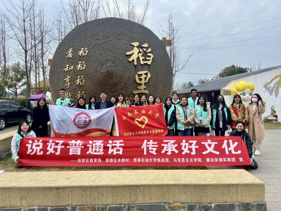 為了解新都區清流鎮水梨村普通話使用現狀,加大國家通用語言文字推廣力度,助力鄉村振興發展,新都區教育局、新都區水梨村、西南石油大學黨委統戰部、馬克思主義學院德法安瀾實踐團合作開展 “說好普通話,傳承好文化—推普進村”活動。3月7日,由新都區教育局教育科科長代明亮、馬院黨委副書記、紀委書記林莉、思想道德與法治教研室楊莉、馬克思主義學院盧士敏老師共同指導帶領學生團隊前往水梨村開展普通話調研活動。