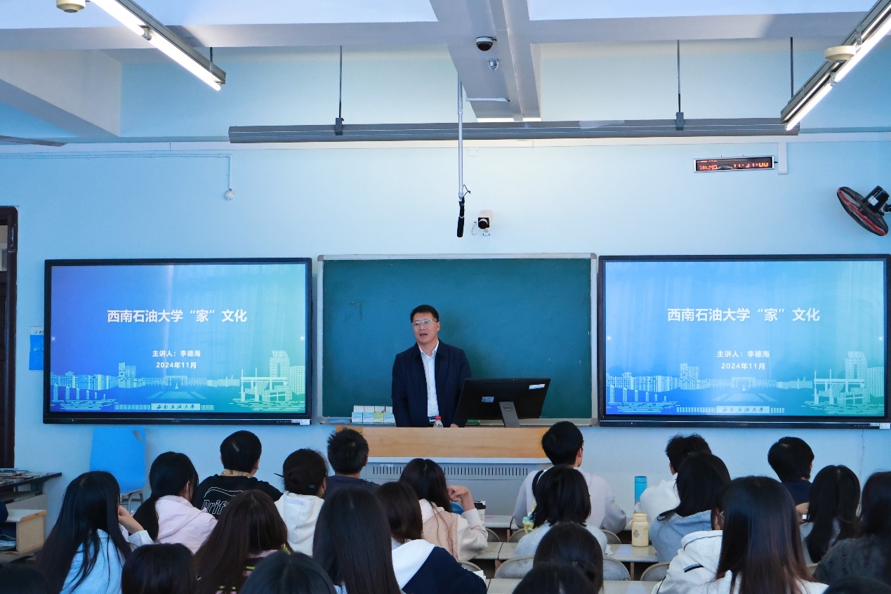 11月4日下午,校黨委常委、副校長李德海在思學(xué)樓C304為外國語學(xué)院英語專業(yè)74名學(xué)生講授了題為“西南石油大學(xué)‘家’文化”的《形勢與政策》課。