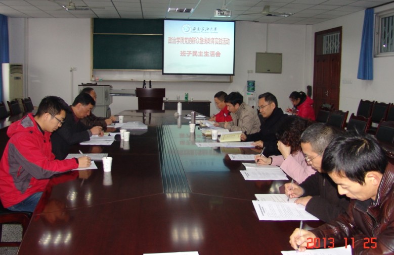 11月25日上午,政治學院在博學樓A508會議室召開了學院黨的群眾路線教育實踐活動黨政領導班子專題民主生活會,校黨委書記孫一平,學校教育實踐活動督導組成員楊華斌、覃吉春,政治學院黨政班子全體成員出席會議。學院院長助理、支部書記、教研室主任及組織員列席會議。會議由學院黨總支副書記帥建祥同志主持。