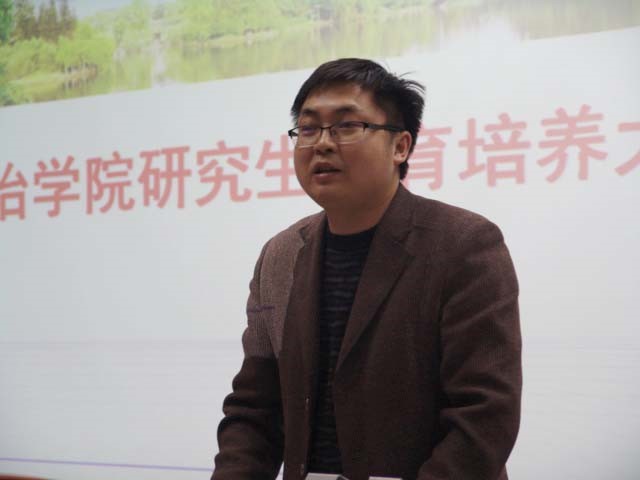 最后,政治學院辦公室主任胡仲成老師宣讀了研究生兼職班主任、研究生分會、研究生分團委相關學生干部名單。教學辦公室主任余冠軍老師簡要將研究生畢業答辯和二年級學生開題相關情況作了說明。學生代表程保晶作為新一屆研會主席作了發言。