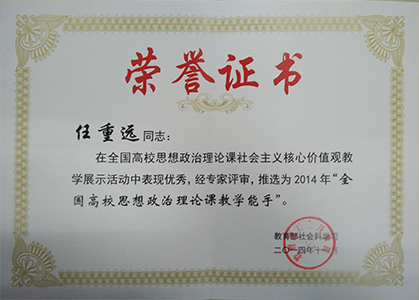 9月份,四川省教育廳對于省內各高校的教學展示進行了評選,任重遠老師的教學展示獲得了專家評委的高度肯定,以排名第一的成績成功入圍,進入教育部的評選,最終入選全國高校思想政治理論課社會主義核心價值觀教學展示活動,并被教育部社科司授予“全國高校思想政治理論課教學能手”的榮譽稱號。