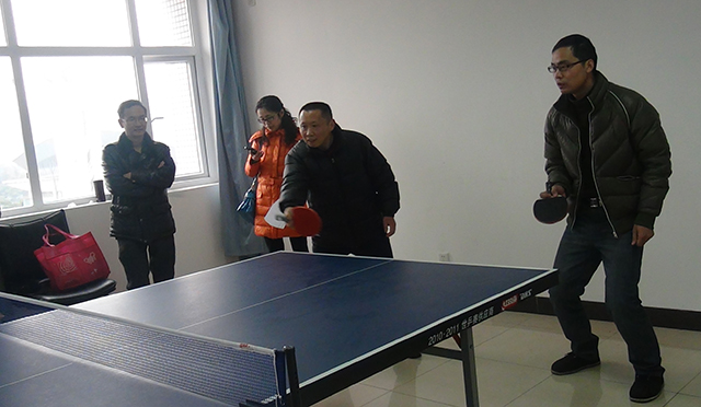 2014年12月25日下午,我院工會舉行了教職工乒乓球對抗賽。思想道德修養與法律基礎、中國近現代史綱要、文化素質三個教研室組成黃隊,馬克思主義原理、毛澤東思想和中國特色社會主義理論概論、形勢與政策三個教研室組成紅隊,兩隊共進行了男子單打、女子單打、男子雙打、女子雙打、混合雙打的比賽,最終黃隊以3:2戰勝了紅隊。在比賽中,教職工們積極參與,認真對待,打出一個又一個的好球,啦啦隊更是搖旗吶喊、助威不停。比賽雙方賽出了水平,賽出了風格。