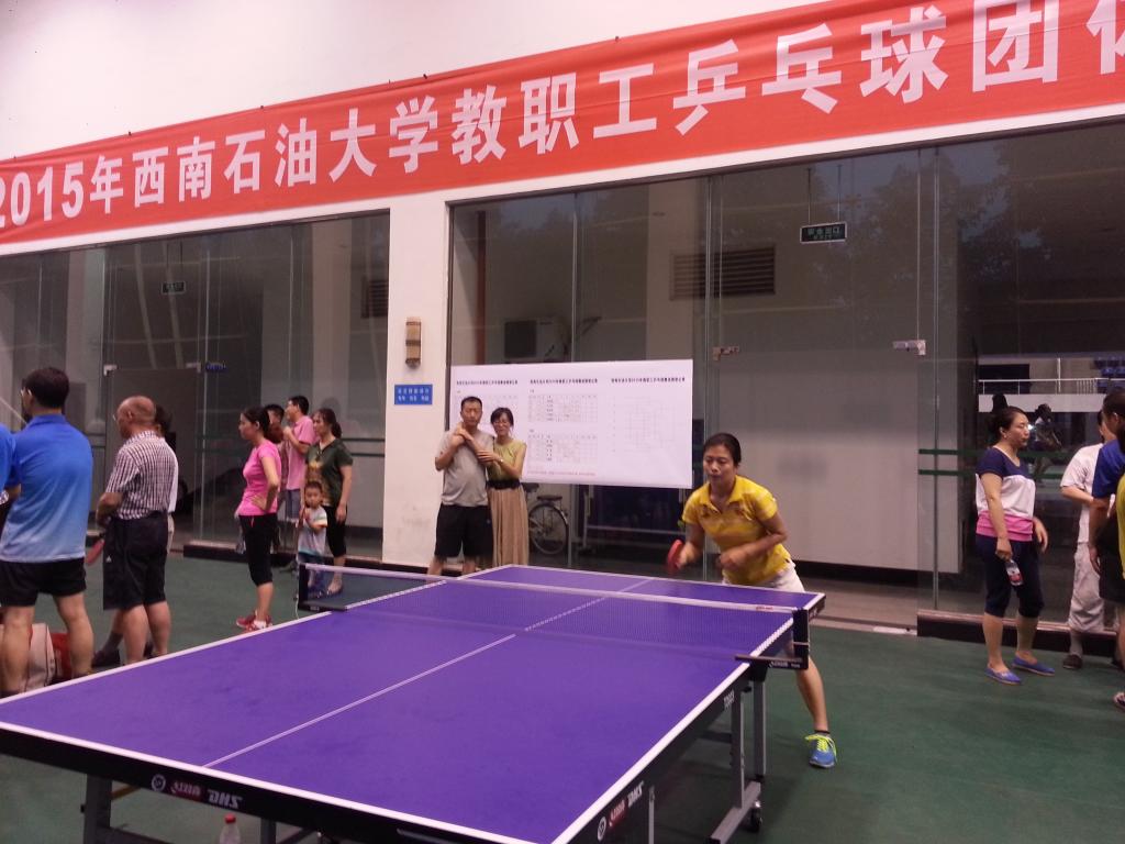 為豐富西南石油大學教職工的業余生活,增強職工的體質,培養職工團結合作精神,西南石油大學2015年教職工乒乓球團體賽于 6月17日在校體育館乒乓球場開賽。此次乒乓球比賽全校共20個代表隊參賽,采用抽簽方式進行分組,我院與理學院、電信院、石工院和法學院分在了A組。先分組循環賽,小組前2名出線,然后前8名再次抽簽進行淘汰賽,循環賽采用5場3勝制,每場采用3局2勝制,淘汰賽采用5場3勝制,每場采用5局3勝制。 出場順序:男單、女單、混雙、女單、男單,(注:男女參賽隊員都不能兼項)。
