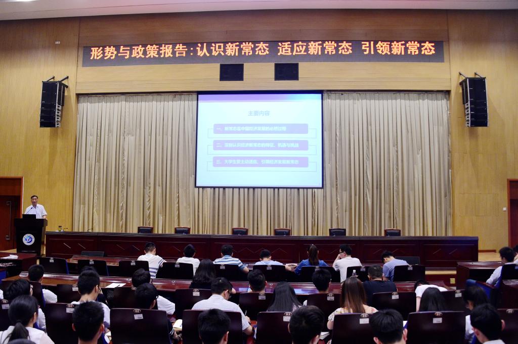 “大學(xué)生要認(rèn)清大勢(shì),練好內(nèi)功,順勢(shì)而為,以時(shí)不我待的責(zé)任感,適應(yīng)新常態(tài)、引領(lǐng)新常態(tài),助推全面深化改革進(jìn)行到底?!?月5日下午,校黨委書記孫一平為我校500多名學(xué)生上了一堂主題為“認(rèn)識(shí)新常態(tài),適應(yīng)新常態(tài),引領(lǐng)新常態(tài)”的形勢(shì)與政策課,增強(qiáng)大學(xué)生對(duì)我國經(jīng)濟(jì)現(xiàn)狀的認(rèn)識(shí)。