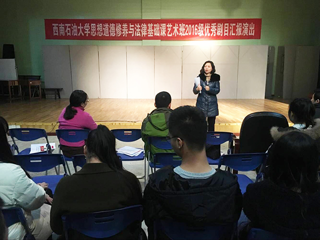 12月18日下午,西南石油大學(xué)2016級(jí)藝術(shù)班情景劇教學(xué)優(yōu)秀劇目匯報(bào)演出在飛翔劇場(chǎng)順利舉行。我校副校長(zhǎng)王玲、教務(wù)處副處長(zhǎng)張華春、馬克思主義學(xué)院院長(zhǎng)張小飛、藝術(shù)班《思想道德修養(yǎng)與法律基礎(chǔ)》課任課老師喻濱、徐科瓊等出席活動(dòng),藝術(shù)學(xué)院2016級(jí)全體學(xué)生參加了這次匯演。