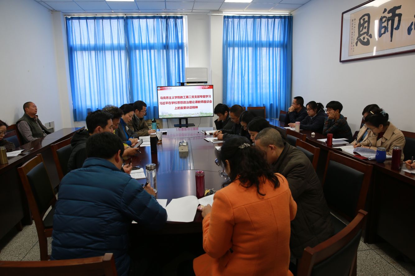 2019年3月21日馬克思主義學院教工第二黨支部在思學樓D504學習習近平在學校思想政治理論課教師座談會上的重要講話精神,并進行交流討論。