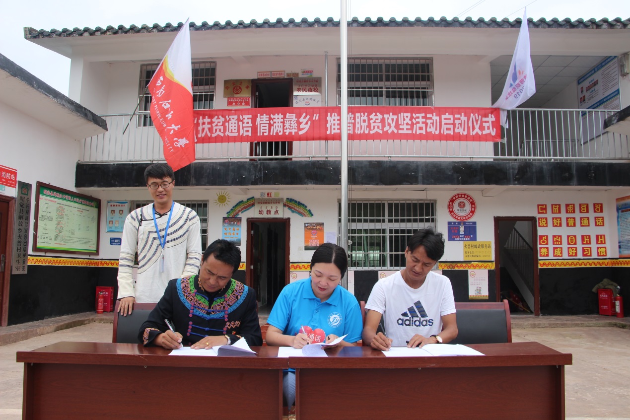 啟動儀式后,我校“扶貧通語,情滿彝鄉”推普脫貧攻堅實踐隊向解放鄉、日哈鄉捐贈了普通話培訓圖書和《平“語”近人——習近平總書記用典》等書籍,同時,舉行了西南石油大學馬克思主義學院與昭覺縣解放鄉火普村、日哈鄉的黨建共建簽約儀式。日哈鄉鄉長阿洛伍哈說:“期待在共建模式下,進一步加強校地基層黨組織建設,深化校地黨組織之間的交流與合作,在黨員干部互動、黨建載體互用、結對幫扶互助、黨建結對互助等方面努力工作,力爭形成資源共享、優勢互補的工作局面。”