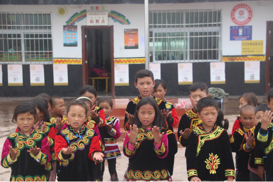成果匯報開始前,趙斯斯老師首先對支持此次西南石油大學推普脫貧攻堅實踐隊工作的各位駐村干部、學生家長以及幼教點的孩子們表示衷心的感謝。隨后進行匯報表演,首先進行了《儀容歌》、《手勢歌》、《站姿歌》等兒童禮儀培訓課程內容的匯報表演,孩子們整齊劃一的動作、甜美的笑容讓人難忘;其次進行了普通話發聲成果匯報,孩子們在操場上齊聲朗讀聲母、韻母、雙音節詞、繞口令等普通話課程內容,看到孩子們普通話發聲水平有所改觀,老師們感到十分欣慰;最后,孩子們進行了國學經典誦讀成果匯報,在小班長的領讀下孩子們大聲誦讀《三字經》的內容,“人之初,性本善,性相近,習相遠,茍不教,性乃遷……”整齊而又稚嫩的童聲回蕩在操場上空。最終,成果匯報在現場熱烈的掌聲中圓滿結束。