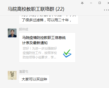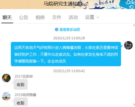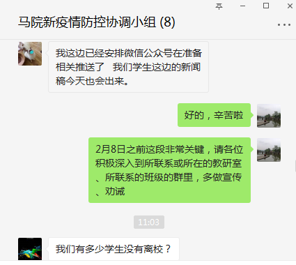 從防疫工作開展以來,學院黨總支書記崔發展、院長張小飛每天在學院輪流值班,負責統籌協調各項防控工作。學院專門建立了“馬院新疫情防控協調小組”微信群,根據上級各類文件與要求部署安排相關工作,并建立“馬院離校教職工聯絡群”,關注每一位離校教師的動向與心理。學院辦公室主任胡仲成及時更新發布“馬院疫情防控教職工信息統計表及最新通知”,通過線上問卷調查的方式對全體師生的健康狀況、當前所在地、預計返校時間等進行了詳細了解,每天統計上報師生疫情防控臺賬。新疫情防控協調小組成員隨時通過全院的QQ群、微信群向全體師生開展防疫知識教育,實時傳達學校關于疫情防控的各項文件和要求,表達對師生員工的關心關懷。