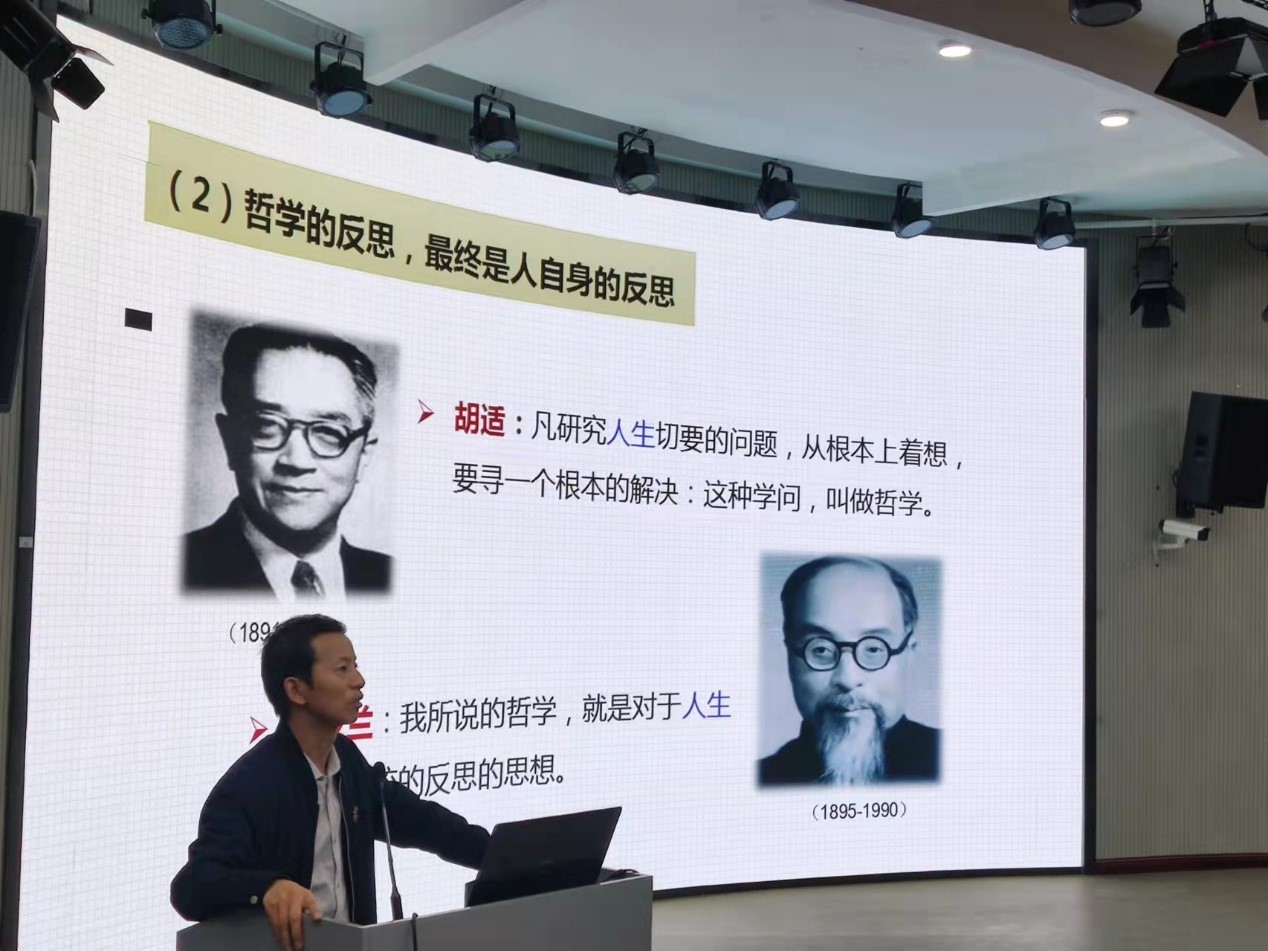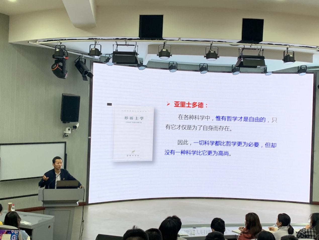崔教授以“哲學——思想的磨刀石”主題,用四個部分向同學們分享了自己多年來的哲學心路歷程。崔發展教授以亞里士多德的一句話,“人是天生的形而上學者”作為引子,將同學們帶入到哲學語境中來,在第一部分的講述中,崔發展教授從何謂哲學談起,從《周易》談到《形而上學》,從中國哲學談到西方哲學,從“哲”字本身解析,用《說文解字》將“哲”字向同學們解釋,即“知也”,順便引用恩格斯的“愛智慧”進一步向大家解釋何謂哲學,并向同學們解釋了當代的八種哲學觀。