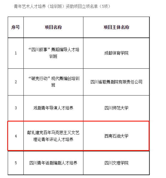 近日,四川省文化與旅游廳藝術處發布《關于四川藝術基金2021年度資助項目立項名單》的公告,根據答辯、綜合評定、審定情況,我院林莉教授主持申報的項目《獻禮建黨百年馬克思主義文藝理論青年評論人才培養》成功入選,獲青年藝術人才培養資助項目立項。