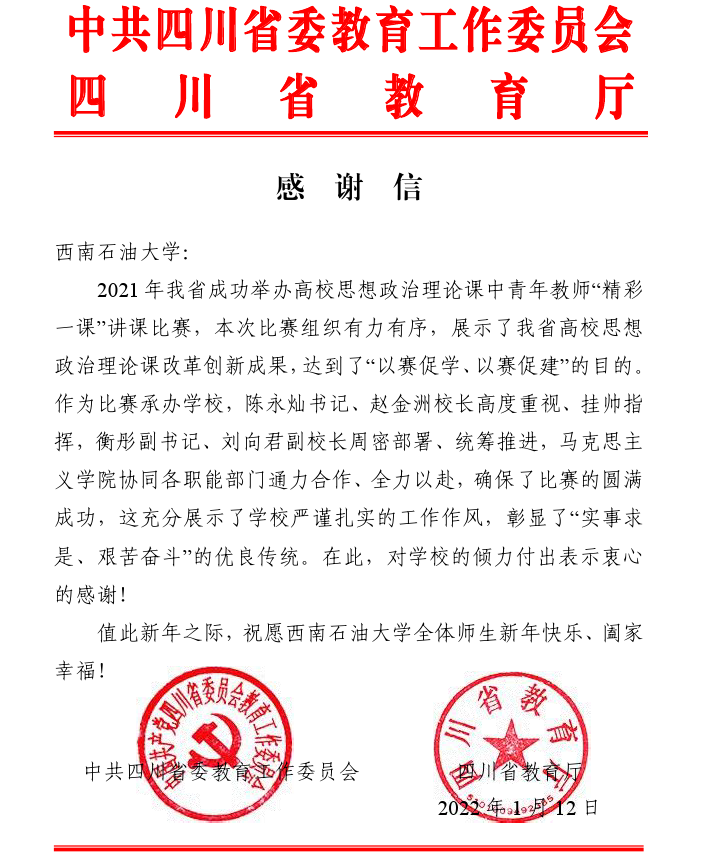 近日,四川省教育廳向學校發來感謝信,對學院在承辦2021年四川省高校思想政治理論課“精彩一課”講課比賽中所做出的重要貢獻表示肯定,對學院以及全體師生表示衷心感謝。