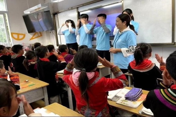 上午9點,實踐團到達三岔河鄉中心學校開始場地布置和教學準備。教學中,林莉教授從簡單的肢體動作教起,一步一步引導孩子們提高對禮儀知識的興趣。團隊成員夏演等人則分別向彝族兒童教授了洗臉歌、洗手歌、問候歌、手勢歌、漱口歌等少兒禮儀操。在輕松歡快的氛圍中,孩子們學會了生活中基本的待人接物禮儀。