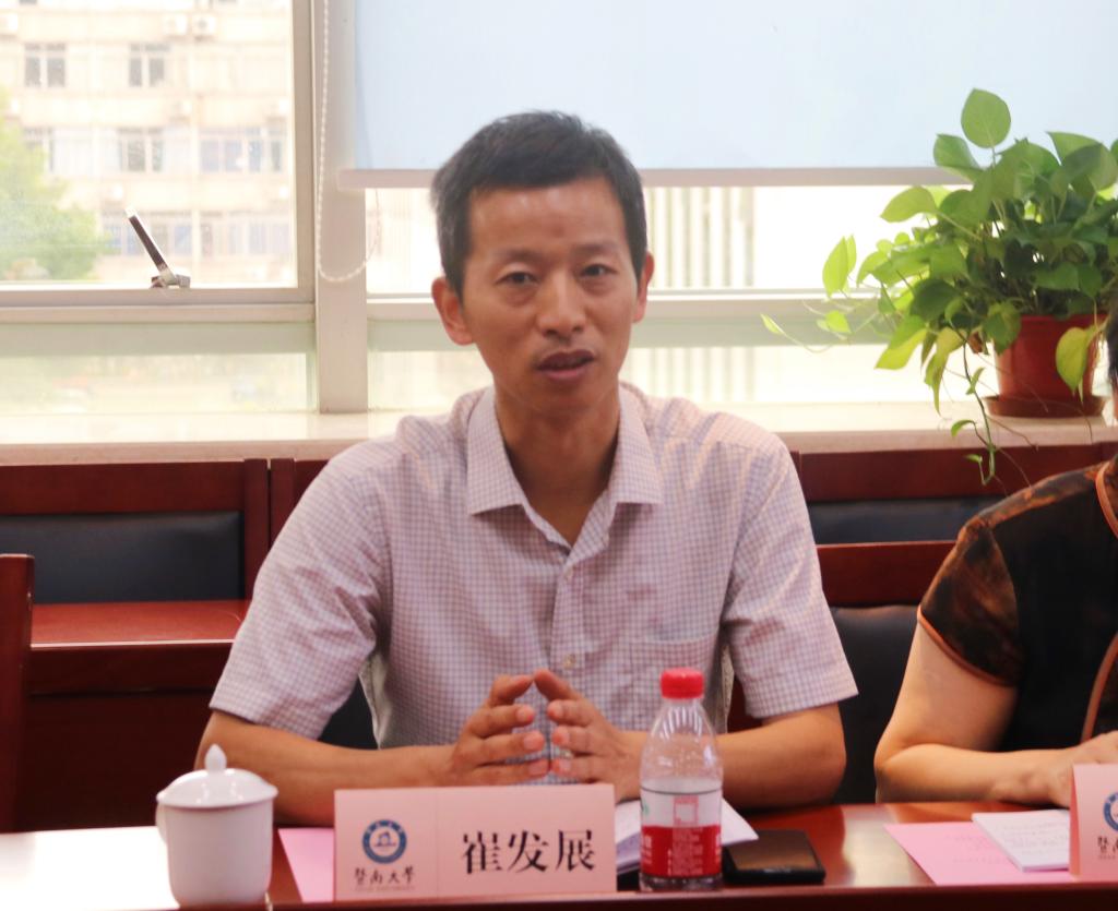 7月1下午,學院黨委書記、院長崔發展教授一行六人到暨南大學馬克思主義學院調研考察開展座談交流。暨南大學馬克思主義學院院長程京武,副院長魏傳光、張龍平,辦公室主任曾煜東,毛澤東思想和中國特色社會主義理論體系概論教研室主任吳昱,形勢與政策教研室主任王高賀,以及部分教師代表參加座談。
