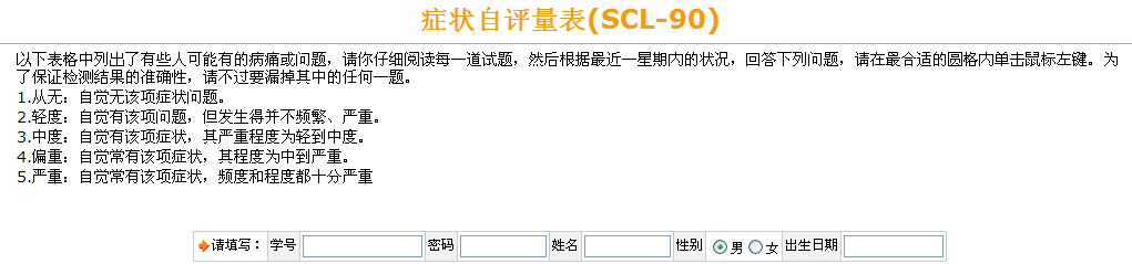 (2)頁面顯示的兩個量表,即癥狀自評量表(SCL-90)和大學生人格問卷(UPI)都需要完成,考生可直接點擊量表名稱,進入測試頁面,如下: